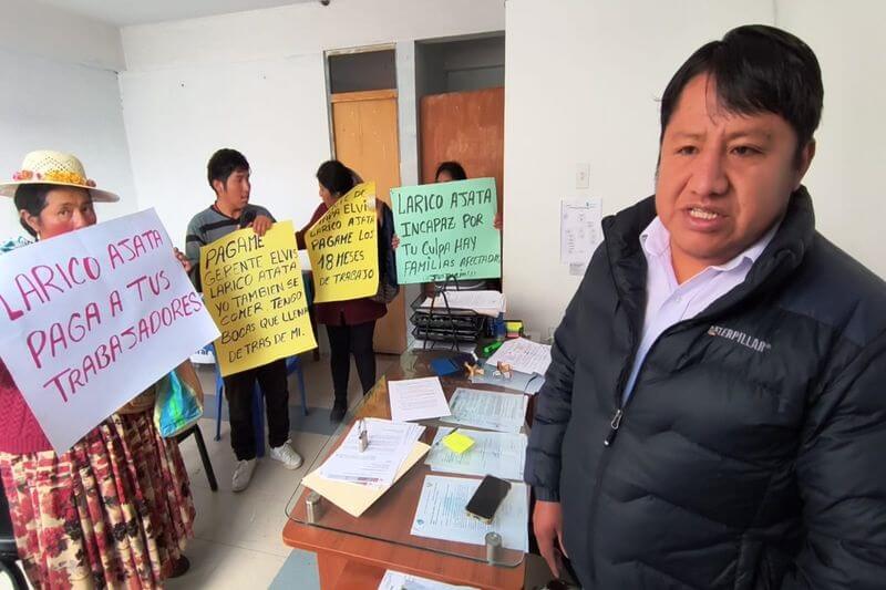 Dos trabajadores que consiguieron su reincorporación judicial no reciben sus sueldos hace 18 meses. A esto se suman supuestos maltratos y acoso laboral del gerente Elvis Larico Ajata.