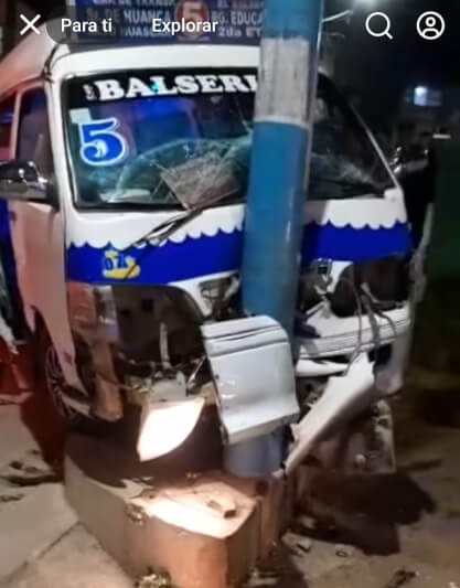 Un aparatoso accidente de tránsito se registró anoche en el barrio Huáscar de la ciudad de Puno, cuando la combi de servicio urbano de la línea 5, con placa Z2D-305 de la empresa de transportes Balserito, se estrelló violentamente contra un poste de alumbrado público, a escasos metros de la comisaría de Huáscar.