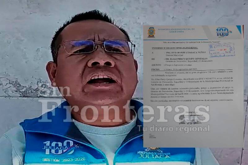 Esta mañana el gerente de Seguridad y Ordenamiento de la Municipalidad Provincial de San Román, Elías Percy Quispe González, presentó su renuncia en medio de serias denuncias por presuntos actos de corrupción y usurpación de funciones públicas.
