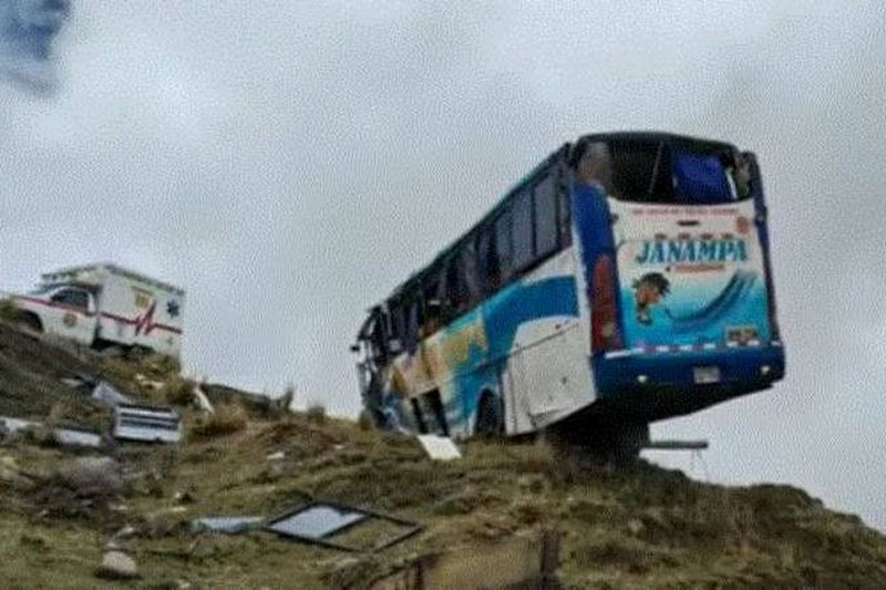 La fuerza del impacto provocó que la parte trasera del ómnibus quedara suspendida al borde de un precipicio, mientras que el automóvil resultó completamente destruido.
