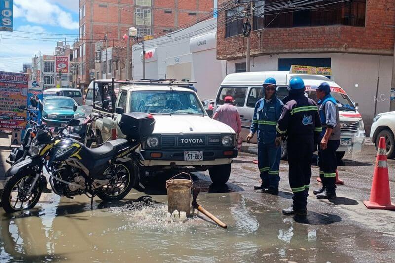 Personal técnico de la Empresa Municipal de Saneamiento Básico de Puno (EmsaPuno S.A.) ejecutó trabajos correctivos en la intersección del jirón Ricardo Palma con la avenida El Sol, tras reportarse el colapso de un buzón de la red de alcantarillado sanitario.