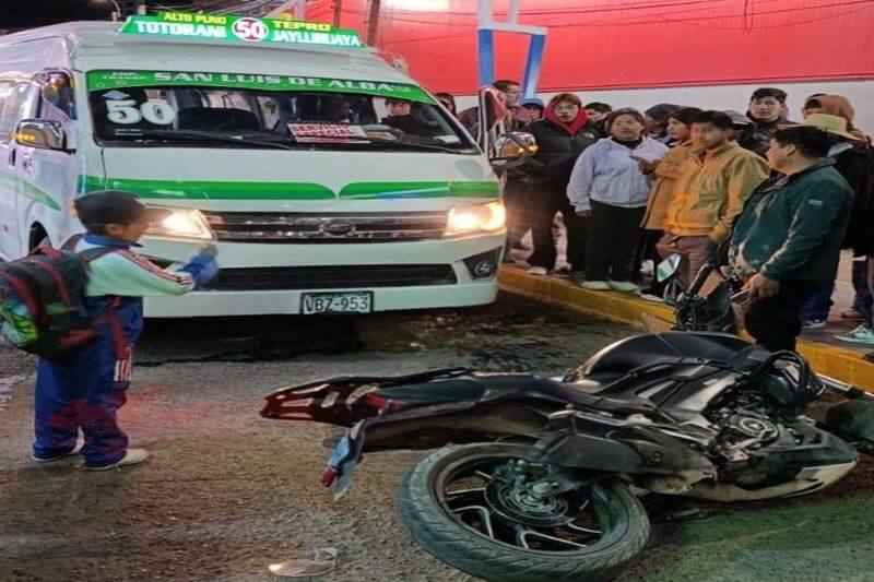 Un motociclista resultó gravemente herido luego de ser embestido por una combi de servicio urbano perteneciente a la empresa de transportes San Luis de Alba, de la línea 50, que cubre la ruta Jayllihuaya–Totorani.