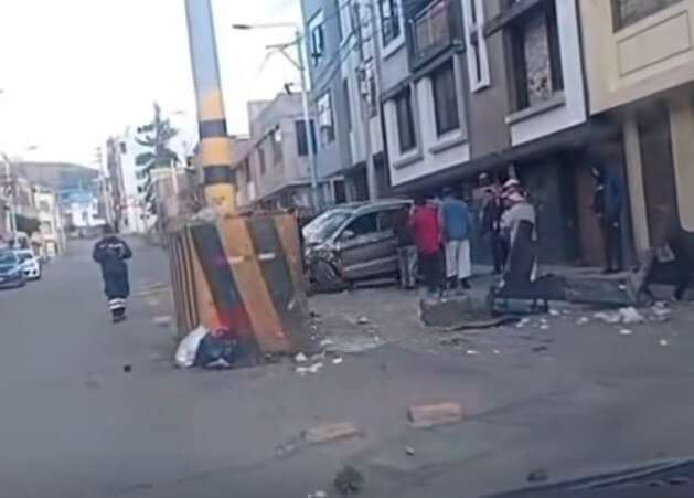 La camioneta Ford color beige, de placa VAC-560, terminó empotrada contra el protector de concreto de un poste de alta tensión, causando serios daños materiales y cerrando un carril de la vía.
