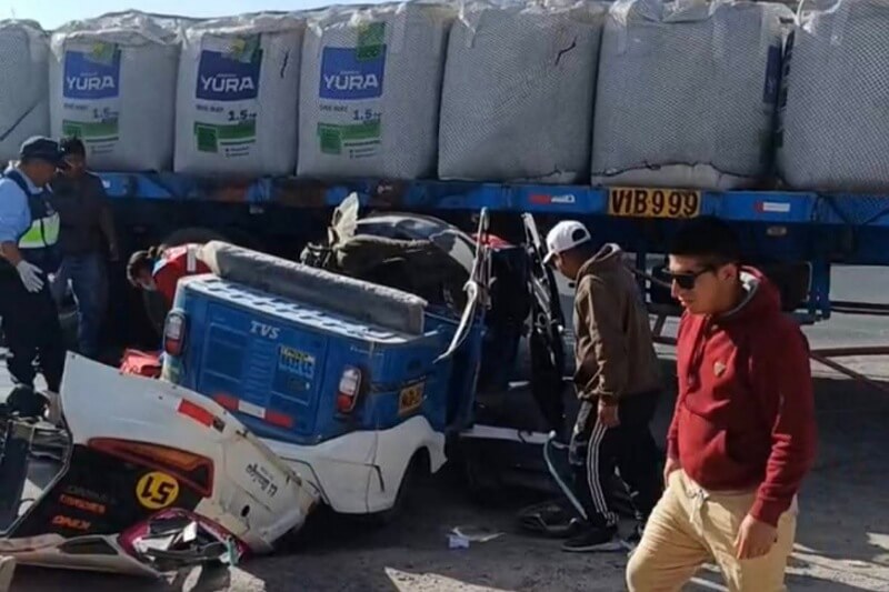 Un violento accidente se registró esta mañana en la vía Arequipa–La Joya, en el distrito de Cerro Colorado. Una mototaxi impactó contra un tráiler cargado con sacos de cemento, quedando completamente destrozada.