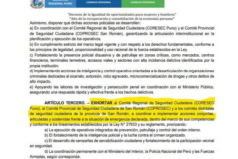 El Consejo Regional de Puno aprobó solicitar al Poder Ejecutivo la declaratoria de emergencia en los distritos de Juliaca y San Miguel, ante el incremento de asesinatos, extorsiones, asaltos y otros hechos de violencia reportados en las últimas semanas.
