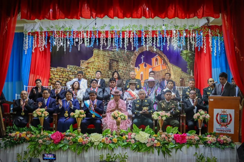 Ayer, la Municipalidad Provincial de Yunguyo celebró su 41° aniversario de fundación política con la tradicional sesión solemne, actividad que fue presidida por el alcalde Ing. Fernando Coya Valdivia. El acto conmemorativo contó con la presencia del cuerpo de regidores y la participación de diversas autoridades regionales y locales, entre ellas la vicegobernadora regional de Puno, Eladia Margot de la Riva Valle, así como de alcaldes provinciales y distritales, representantes de la Policía Nacional del Perú y otras instituciones invitadas.