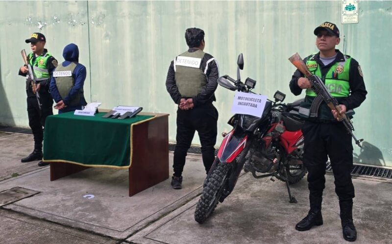 Según el reporte oficial, los agentes intervinieron a dos jóvenes de 20 y 22 años que se desplazaban en una motocicleta negra con rojo, sin placa de rodaje. Su actitud levantó sospechas mientras circulaban por la vía.